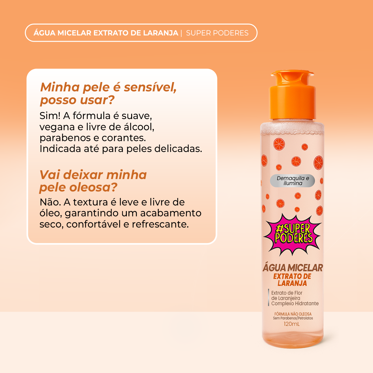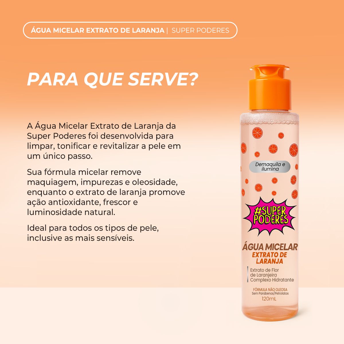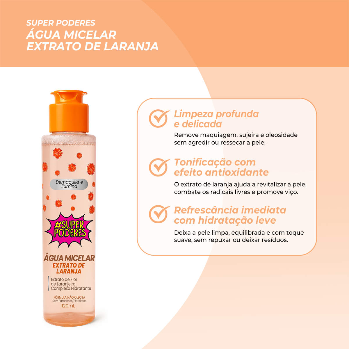 A Água Micelar com Extrato de Laranja Super Poderes da Max Love combina tecnologia micelar com o poder antioxidante e revitalizante da laranja. Ideal para limpar, tonificar e remover maquiagem, ela purifica a pele sem ressecar, ao mesmo tempo em que oferece frescor e luminosidade natural.