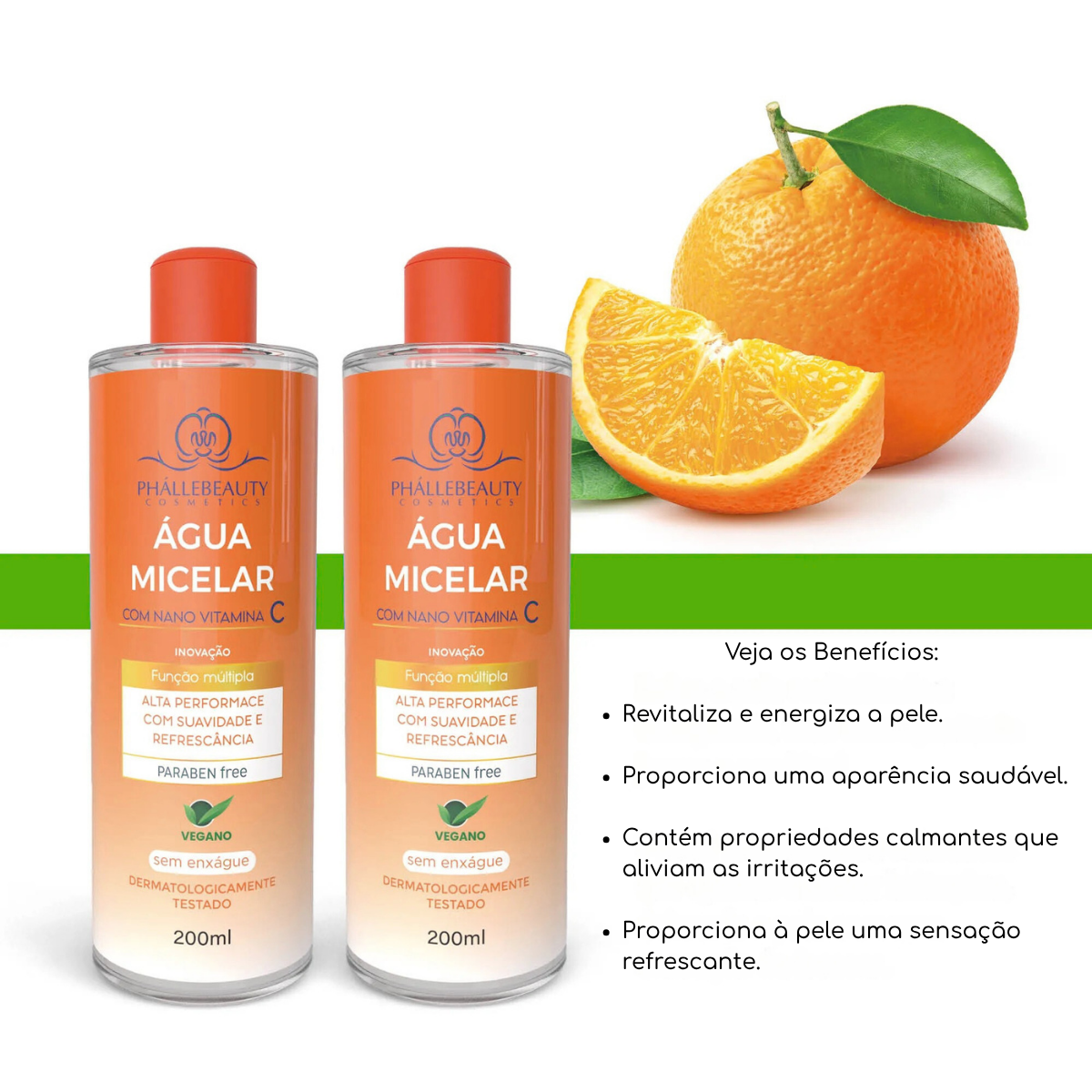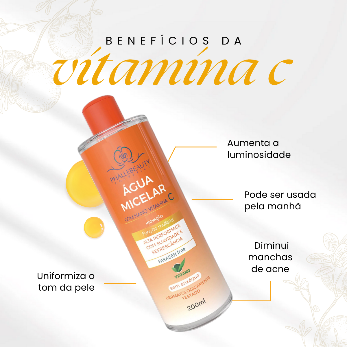 A Água Micelar com Vitamina C da Phallebeauty une a limpeza suave e profunda da pele com os benefícios da vitamina C, reconhecida por sua ação antioxidante, iluminadora e revitalizante. Ideal para remover impurezas, resíduos de maquiagem e poluição, enquanto tonifica e melhora o viço da pele.