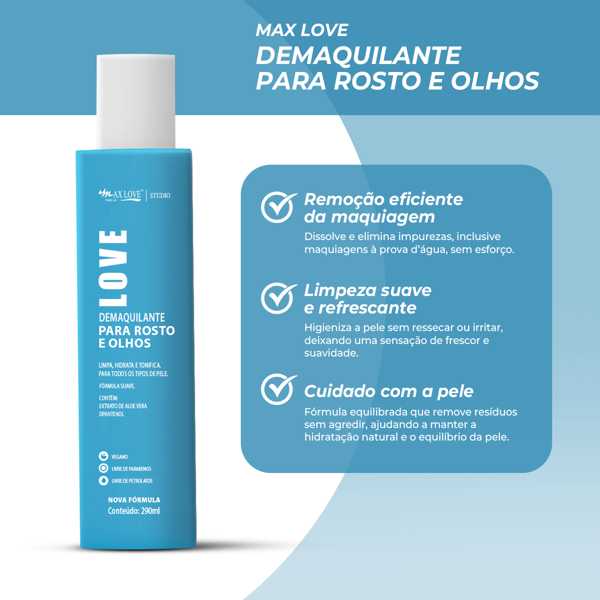 Remova sua maquiagem com suavidade e eficiência com o Demaquilante para o Rosto e Olhos da Max Love! Desenvolvido para limpar profundamente sem agredir a pele, ele dissolve impurezas e maquiagem, inclusive à prova d’água, garantindo um rosto limpo, fresco e hidratado.