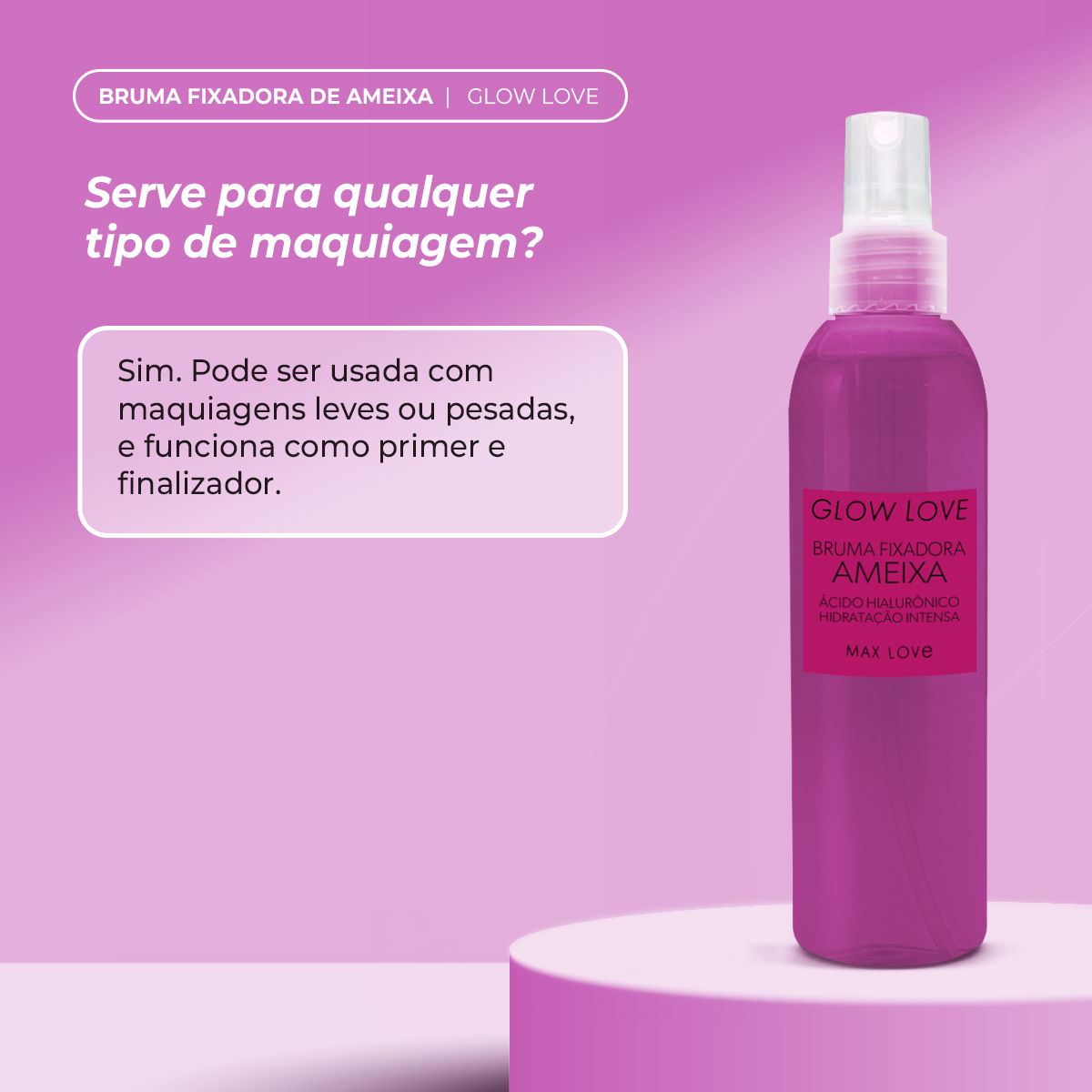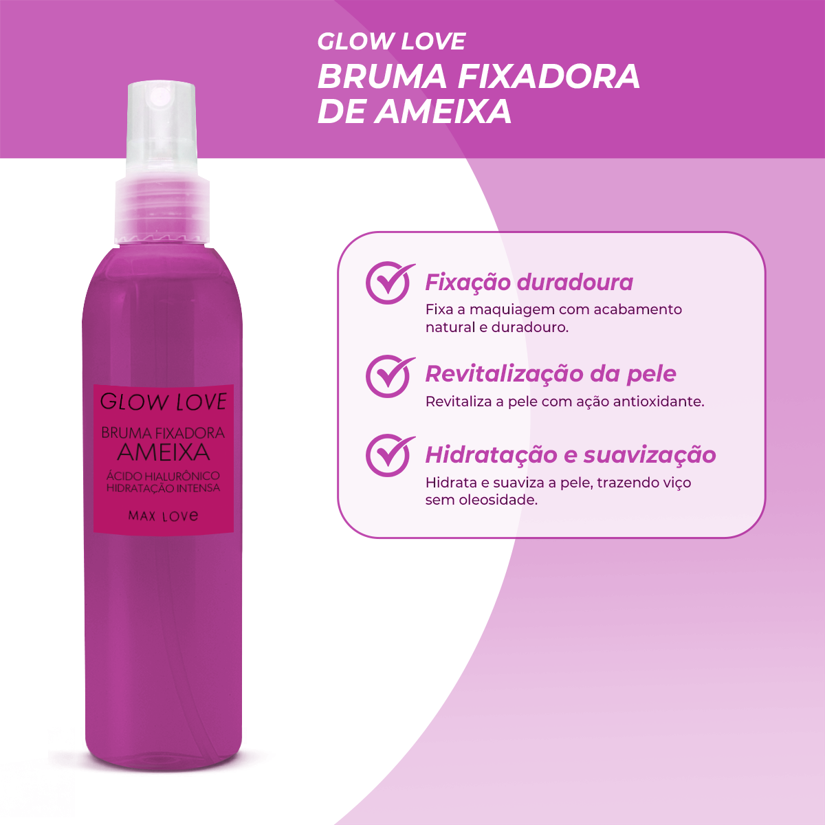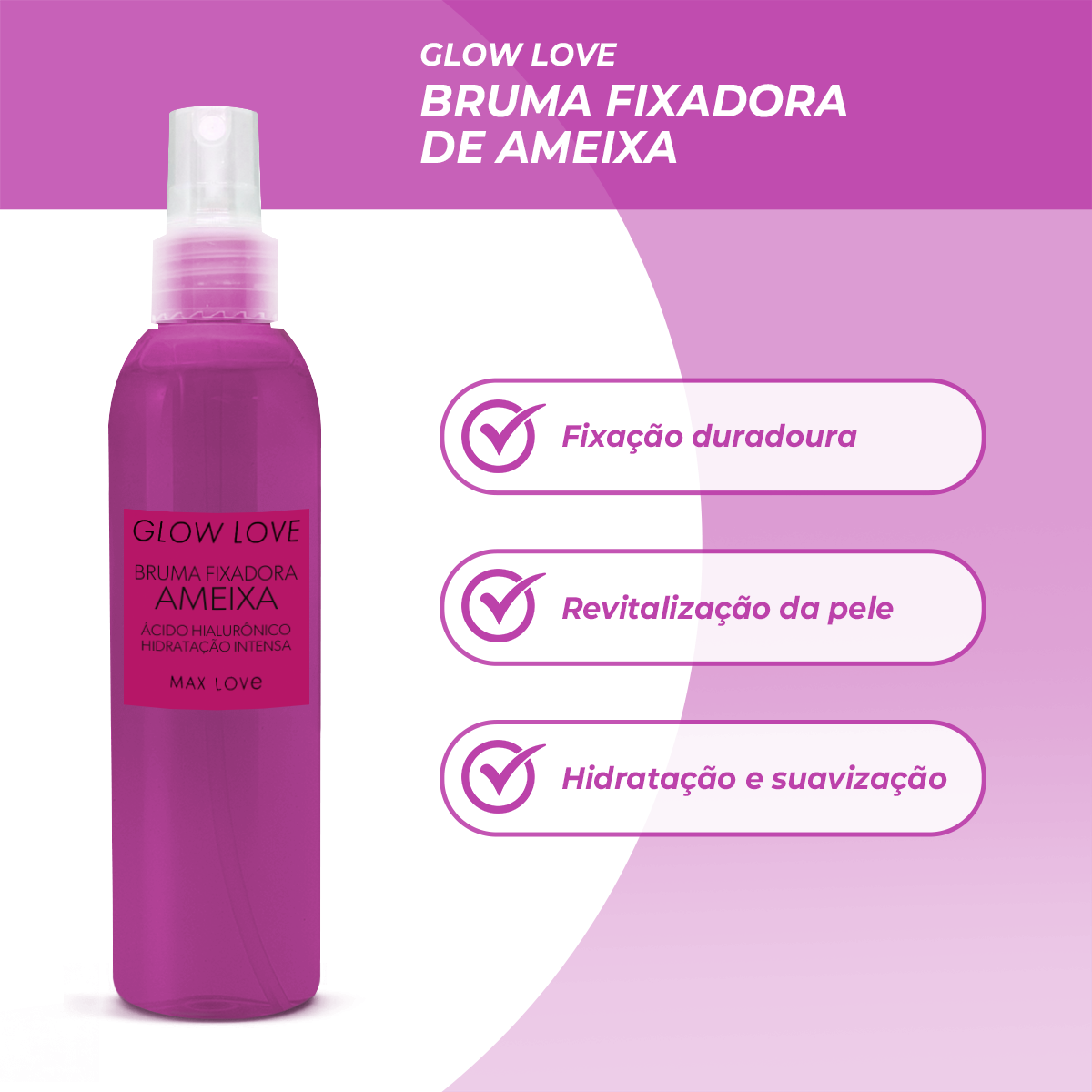 A Bruma Glow Love com extrato de ameixa combina ativos hidratantes e antioxidantes que ajudam a manter a maquiagem por mais tempo, enquanto promovem glow natural e sensação de frescor. A fórmula leve é ideal para uso diário e para todos os tipos de pele.