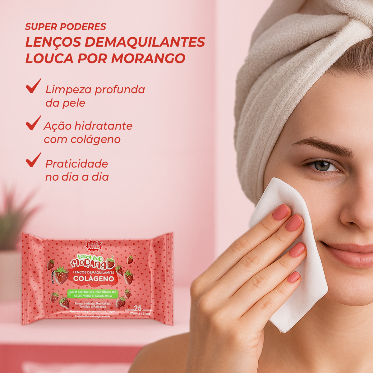 Você merece terminar o dia com a pele tão incrível quanto começou – e sem esforço! O Lenço Demaquilante de Colágeno com Cheirinho de Morango Super Poderes é a combinação perfeita entre cuidado, praticidade e aquele cheirinho delicioso que vai transformar sua rotina de beleza em um momento de puro autocuidado.